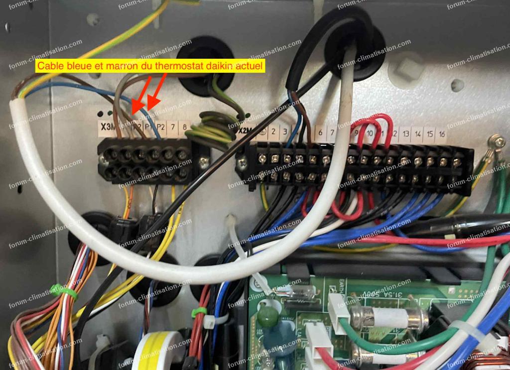 Actuellement, j’ai le thermostat basique de Daikin branché avec deux câbles sur P1/P2 (un marron et un bleu), connectés sur X3M.