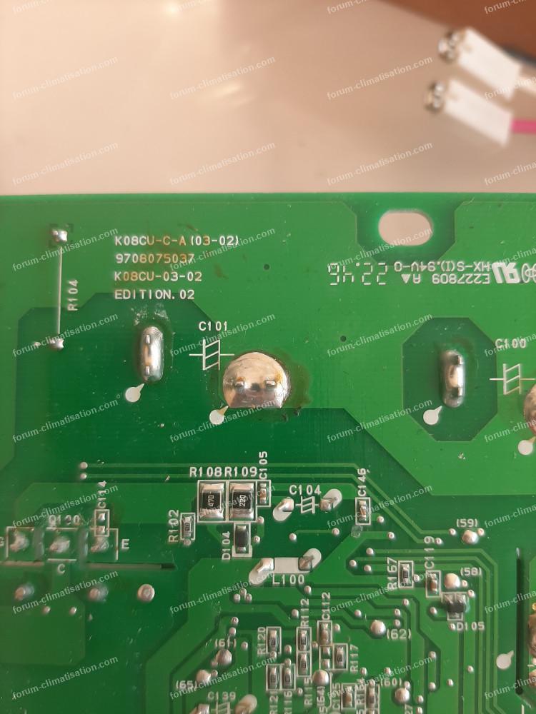 La cause de la panne semble être des chutes de tension secteur, qui faisaient un carnage chez les clims Sanyo. Elles stressent la partie PFC de la carte (power factor correction), dont les éléments principaux sont le gros transistor et l'inductance déportée. Le claquage du transistor a provoqué celui de D105, et probablement le circuit qui pilote le transistor, peut-être le microP, et là, c'est irréparable, un microP ne peut se changer. Donc pronostic plus que réservé sur la possibilité de réparer la carte.