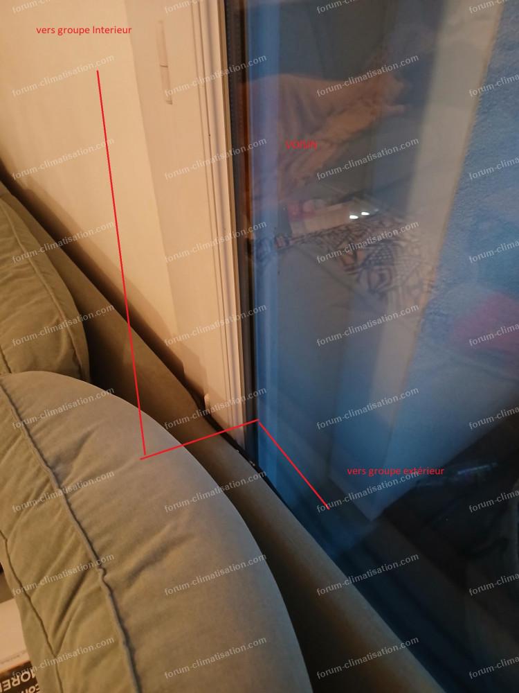 Je ne peux pas faire un seul trou (si je perce à cet endroit) car ma baie vitrée est à fleur du mur, donc je dois la contourner par ce fameux angle à 90 degrés, j'espère que ça se verra sur la photo