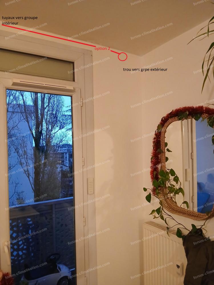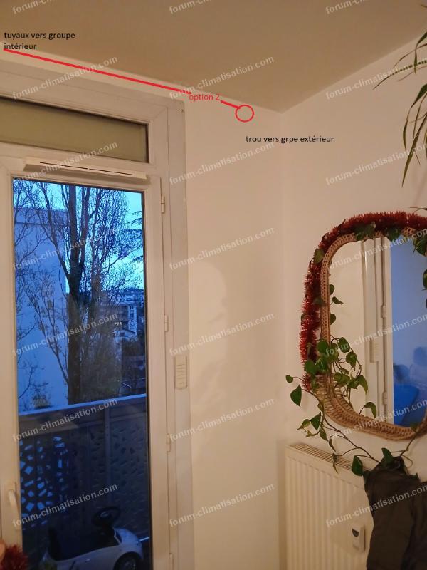 Reste l'option deux, percer comme sur la photo pour redescendre sur le balcon, un seul trou, mais plus long de tuyaux/ goulotte (pas grave), mais le groupe sera "au milieu" du balcon (les canalisations préchargées font 6 Mètres maximum), et risque aussi de trouver un montant en acier dans le mur...
