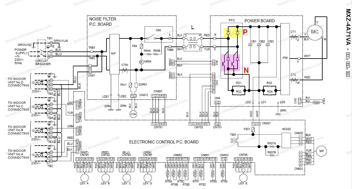 consulter ce sujet Panne unité extérieure Mitsubishi MXZ-4A71VACes surchauffes sont sur les circuits de communication qui partent vers les UI, probablement dues à une inversion phase / neutre, car normalement ces circuits ne chauffent pas au point de roussir le circuit imprimé. En aucun cas elles vont vous faire griller le fusible F64.